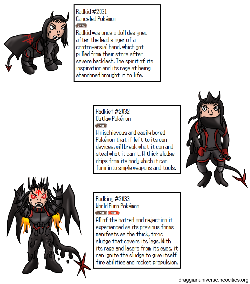 When I came up with a Pokemon team for him, it ended up being mostly Dark, save some adjustments for thematic appropriateness (namely, Midnight Lycanroc and Galarian Slowking.) I assume he's dual type fire because of WTWB / Ronald? Radkid -> Radkief -> Radking, my Canceled Buddy Pokemon, is Dark / Fire, so that's reasonable. I wouldn't assign Fire to Ronnie IRL, though, which this seems to be, vs. his sona.