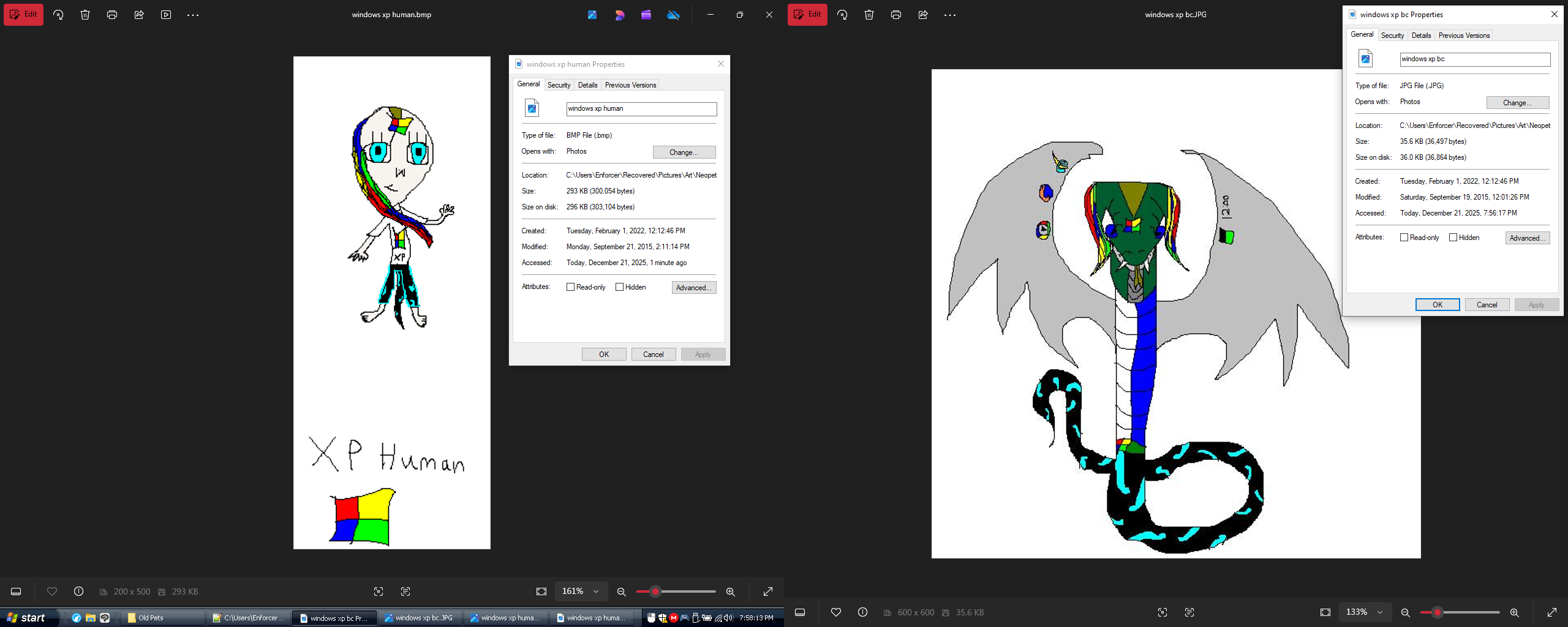 Here's some gross old art screenshotted with its properties to cite that I did indeed originate this character in 2015, WAY before Windows XP was deemed a cool, somehow defiant and politically leftist (no.) thing for folks to like. This was the Escape from XP era. Don't fuck with me. I have forgotten more than you will ever know, and I have been through it.